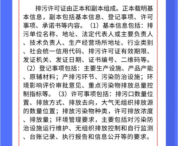 排污许可证是实施排污许可制的重要载体,是排污单位在生产运营期接受环境监管和环境保护部门实施监管的重要法律文书,是排污单位守法、部门执法、社会监督的重要依据。生态环境部门通过刻发排污许可证并依证监管实施排污许可制,纳入排污许可管理的排污单位必须如期持证排污、按证排污,不得无证排污。排污许可证由正本和副本构成,正本载明基本信息,副本包括基本信息、登记事项、许可事项、承诺书等内容。